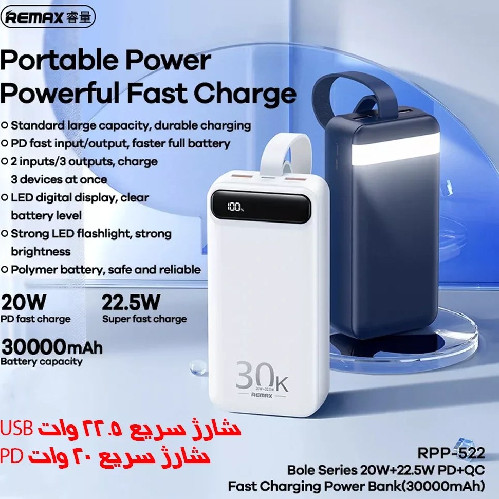 پاوربانک 30000 ریمکس RPP-522 یک خط باتری پشتیبان 30000 میلی آمپر ساعتی با طراحی خروجی 2 پورت USB و 1 پورت Type C برای توانایی شارژ همزمان 3 دستگاه با حداکثر توان خروجی تا 22.5 وات است. یکی از ویژگیهای برجسته این پاوربانک این است که به یک چراغ LED بسیار درخشان در بالای باتری مجهز شده است میتواند به شما کمک کند در شرایط کم نور به راحتی کار کنید، حتی خواندن کتاب برای شما سخت نخواهد بود. استفاده بسیار ساده است، فقط کافی است دکمه پاور را حدود 5 ثانیه برای استفاده فشار دهید و نگه دارید. پاوربانک 30000 ریمکس RPP-522 مجهز به صفحه نمایش دیجیتالی است که ظرفیت باتری باقیمانده را نشان میدهد و به کاربران کمک میکند ظرفیت باتری را کنترل کنند، در نتیجه در صورت لزوم شارژ میشود و استفاده طولانی مدت از باتری را تضمین میکند. جزئیات پوسته با پلاستیک ABS با کیفیت بالا، سطح کمی زبر برای حمل محکم و ایمن، ضد خش، ضد لغزش و مقاوم در برابر دماهای بالا تکمیل شده است. علاوه بر این، پاوربانک به یک دکمه پاور نیز در کنار آن مجهز شده است که به کاربران این امکان را میدهد تا به راحتی دستگاه را روشن/خاموش کنند و ظرفیت باتری را برای استفاده طولانی مدت حفظ کنند. یکی دیگر از ویژگیهای برجسته پاوربانک Remax RPP-522 نوع C سرعت شارژ سریع و راندمان شارژ بالا است. با فناوری شارژ سریع QC3.0 Max 22.5W برای دو پورت خروجی USB-A است. فناوری شارژ سریع دو طرفه PD 20 واتی برای درگاه Type-C، خروجی 20 وات و قابلیت شارژ ورودی 18 وات را ارائه میدهد. از آنجا، کاربران میتوانند به راحتی دستگاههای خود را سریع و راحت شارژ کنند. علاوه بر این، قابلیت شارژ چندین دستگاه به طور همزمان نیز یک مزیت مهم است. به شما کمک میکند بدون نگرانی در مورد سرعت شارژ یا عملکرد، تلفن و تبلت خود را همزمان شارژ کنید. از نظر ظرفیت باتری، پاوربانک Remax RPP-522 مجهز به هسته باتری پلیمری با کیفیت بالا با ظرفیت 30000 میلی آمپر ساعت است. میتوانید از این باتری برای تامین انرژی بسیاری از دستگاههای تلفن همراه، هدفون، ساعت، تبلت و غیره استفاده کنید.